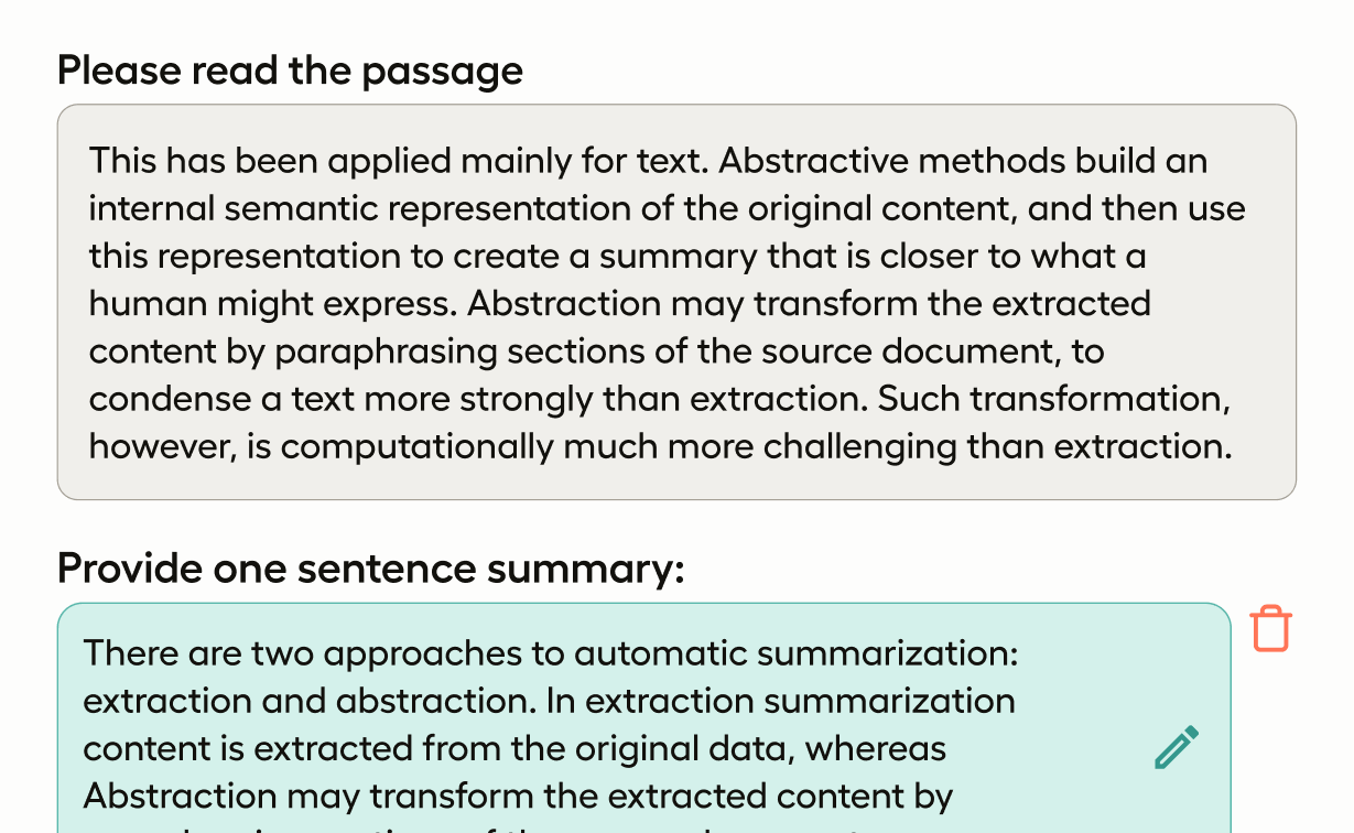 Use the TextArea control tag to provide a text box with a submit button that annotators must type a summary into and can edit their responses: